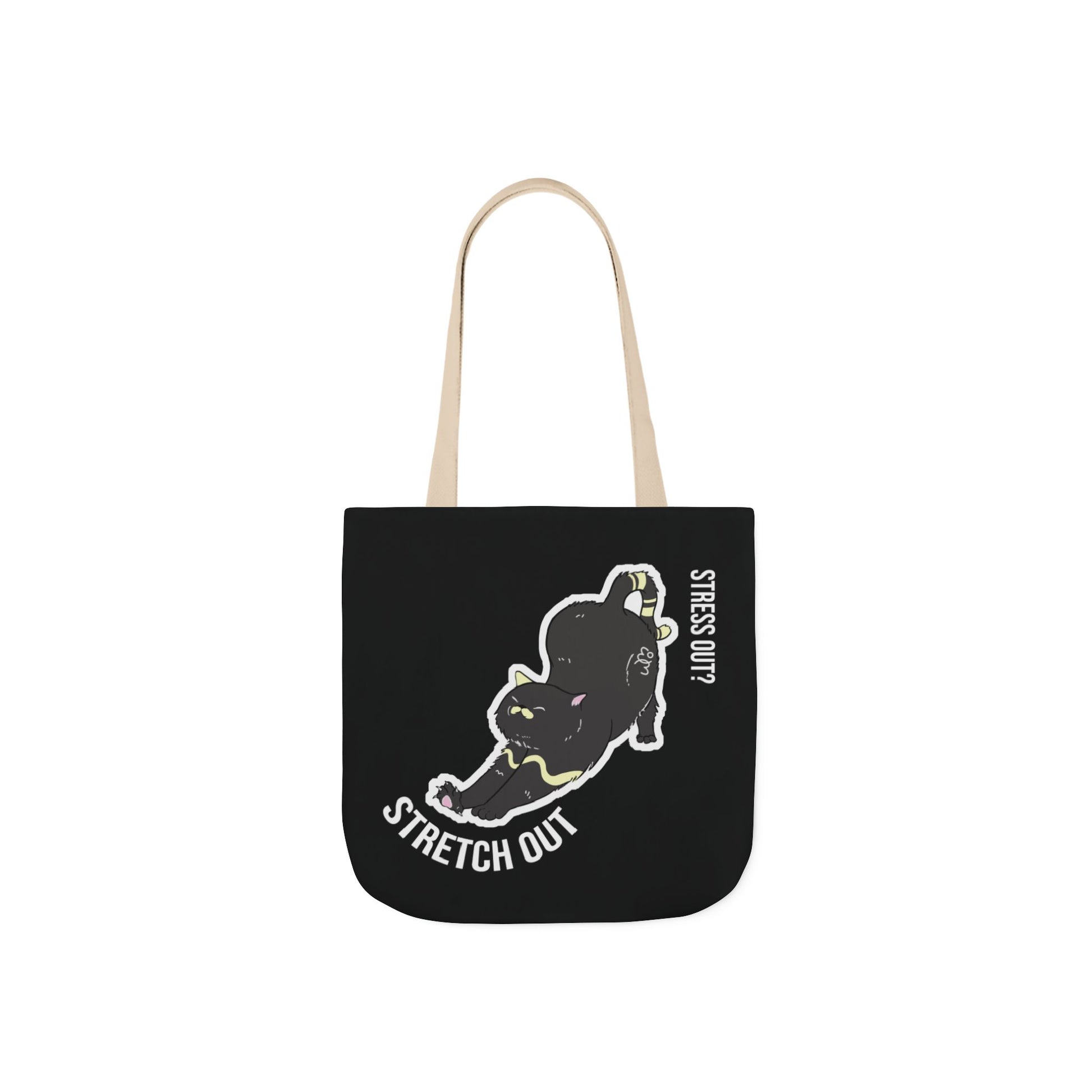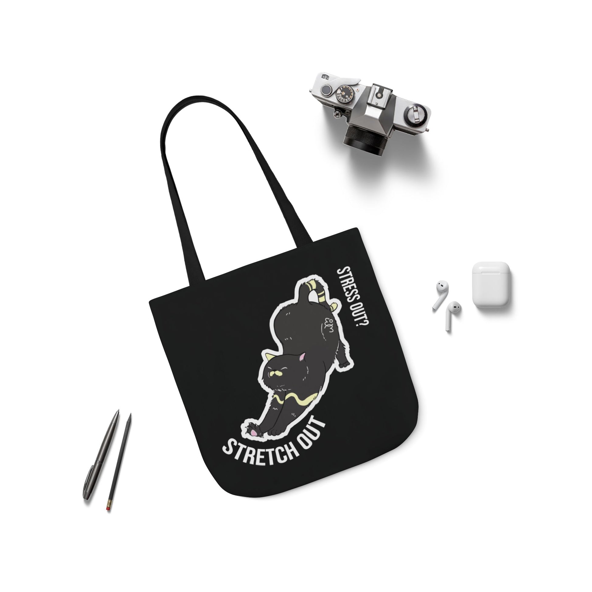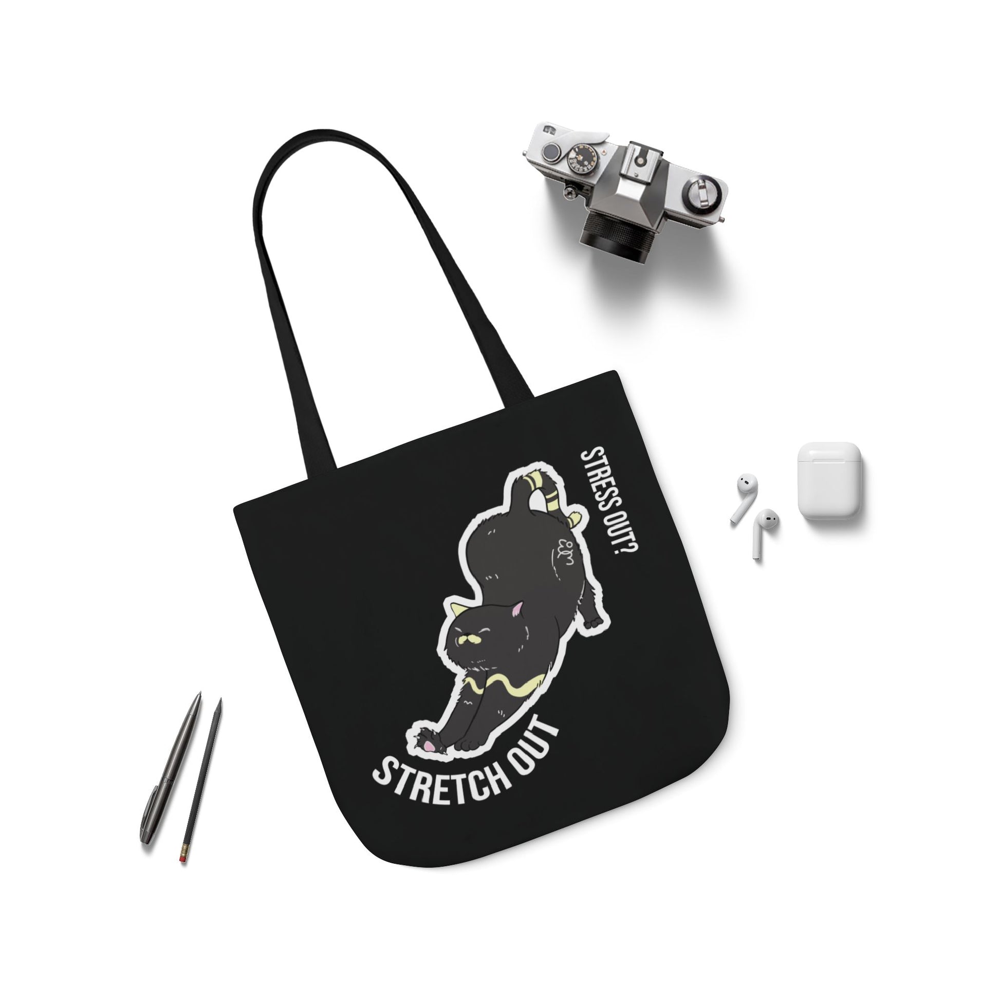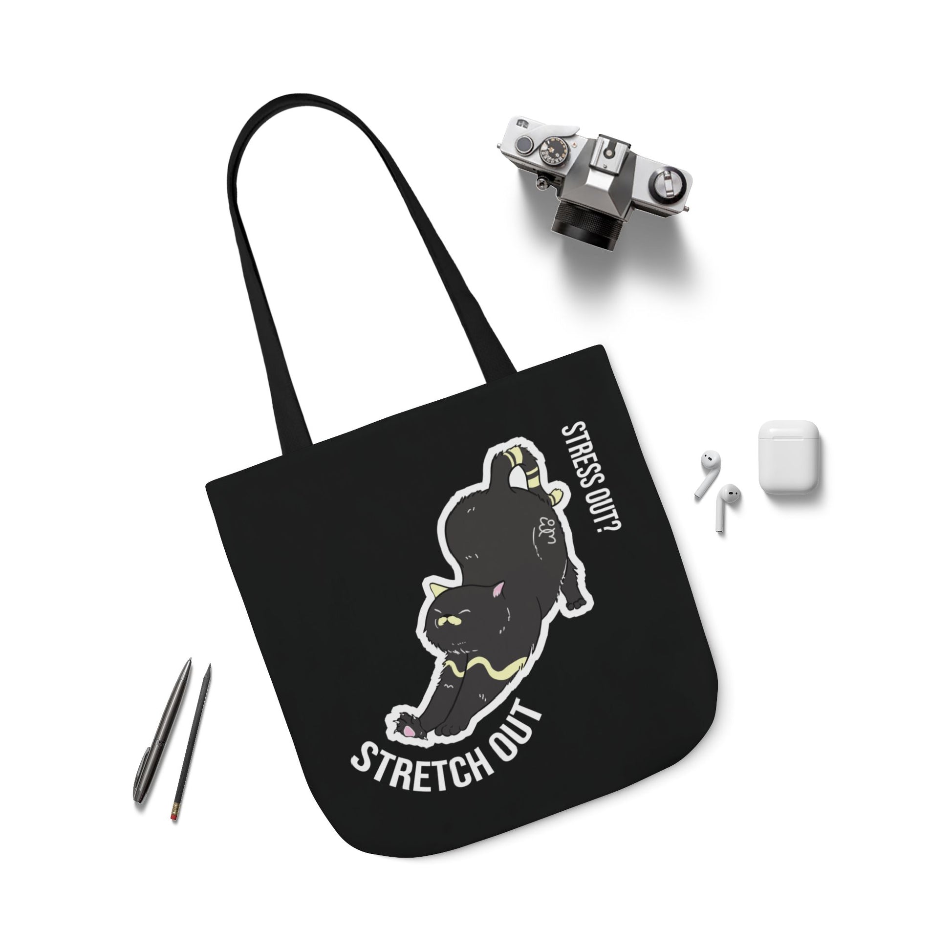 Carry good vibes everywhere with the Stress Out? Stretch Out Black Canvas Tote Bag. Designed for everyday use, this tote combines durability, style, and a playful cat graphic that inspires you to relax and stretch through life.